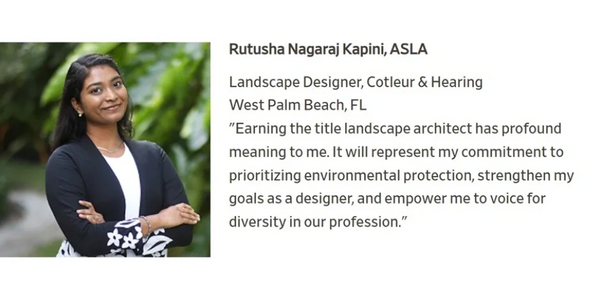 The Anova Furnishings 2022 National L.A.R.E Grant Competition is designed to help selected individuals achieve their goals of becoming licensed landscape architects. Rutusha was one among the national winners who was nominated by Nicole Plunkett.